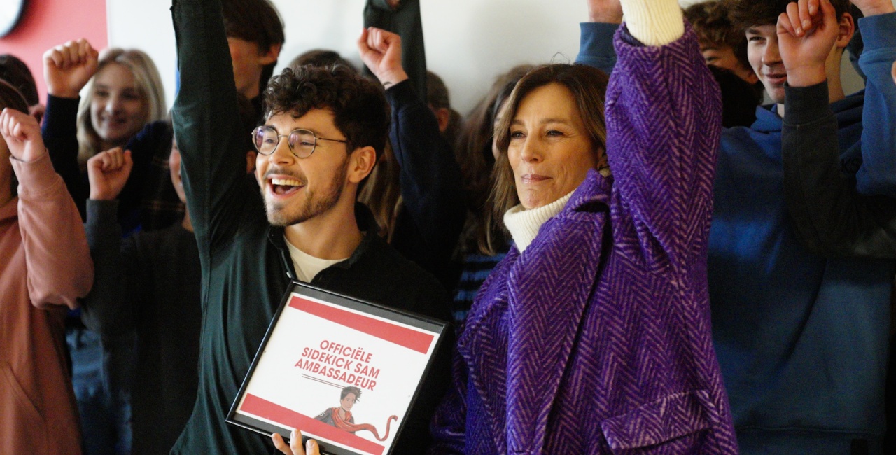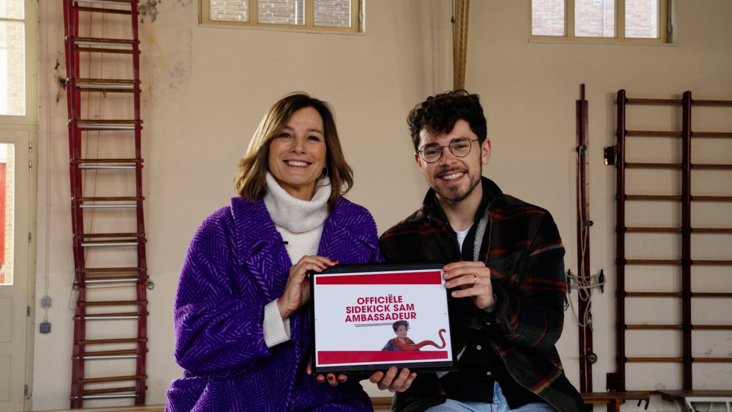 ‘Ik ben ervan overtuigd dat je als leerkracht écht het verschil maakt’, zegt Brecht. Een visie die helemaal matcht met de Sidekick Sam Academy, een online platform voor leerkrachten rond mentaal welzijn op school. ‘Geëngageerde leerkrachten die dicht bij hun leerlingen staan zijn goud waard’, zegt ambassadrice Birgit Van Mol. ‘Bij de Sidekick Sam Academy vinden we dat elke leerling zo’n Sidekick Sam verdient. Iemand met fijne voelsprieten, die er voor z’n leerlingen is als het even niet gaat. Iemand zoals Brecht, dus.’ Voor Valentijn trok ze met een bijzondere vraag naar het College Melle, waar Brecht lesgeeft: ‘Wil jij samen met mij ambassadeur van de Sidekick Sam Academy worden?’ Alweer klonk een welgemeende ‘ja’. ‘Het is een hele eer dat ik mee ambassadeur mag zijn van dit fantastische project’, zegt Brecht De Geyter. ‘Elke leerling verdient iemand die voor hem klaarstaat, dag in, dag uit. Een Sidekick Sam dus. Samen maken we onze jeugd veerkrachtiger dan ooit.’